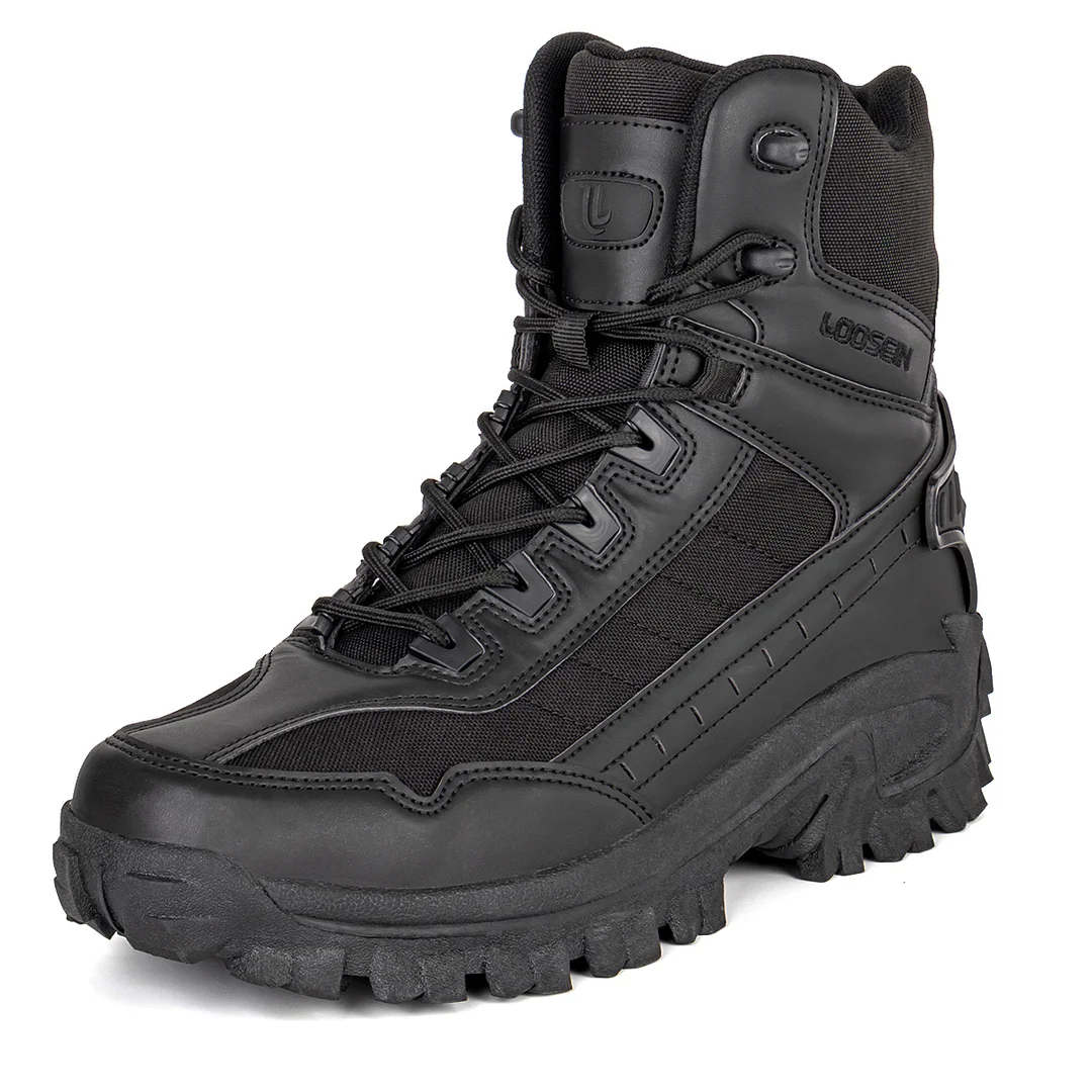 The upper part of the hiking boots is crafted from Tactical Nylon and suede leather. providing high scratch and abrasion resistance. The gusseted tongue prevents pebbles. sand. dirt. and other debris from entering these combat boots. With excellent workmanship. the hiking boots are of very high quality and durability.